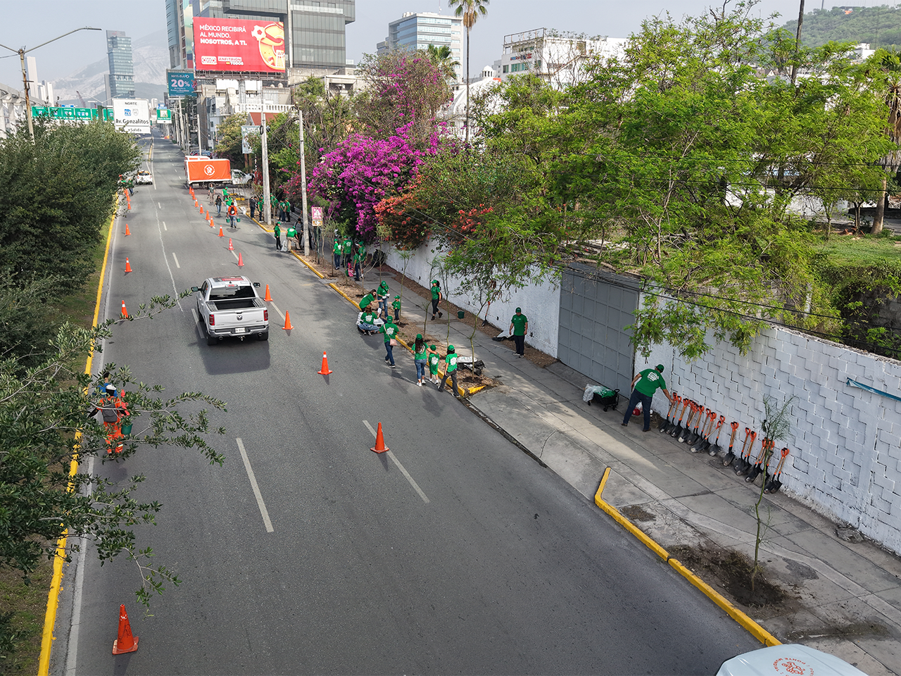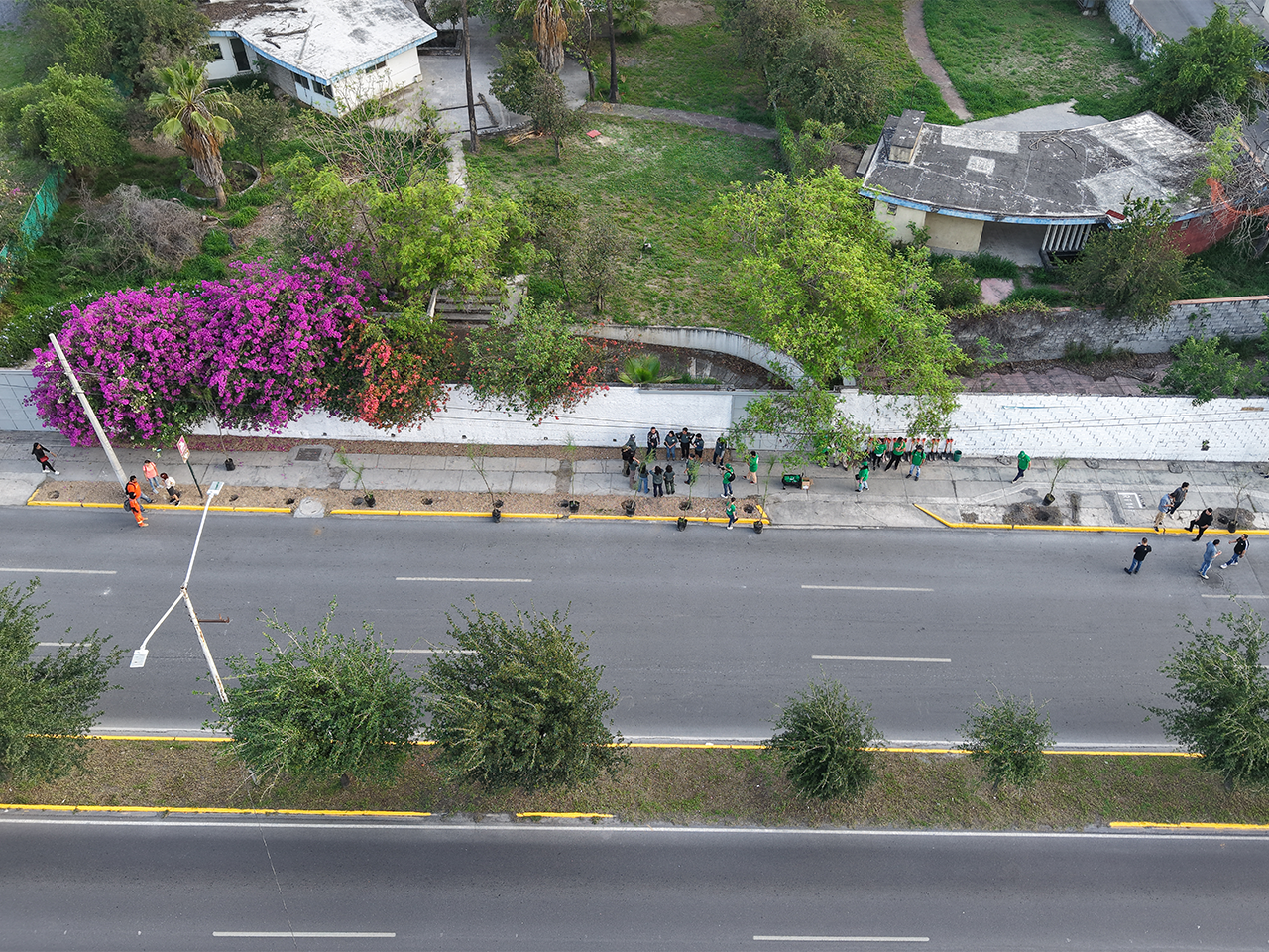 Decenas de empleados y voluntarios, acompañados de sus familias, plantaron árboles en un tramo del Par Vial Morones Prieto–Constitución, a la altura del Monumento a la Virgen, como parte de una intervención integral de reforestación urbana.