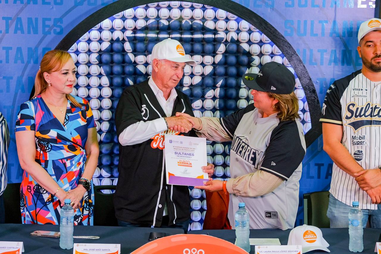 Durante el acto protocolario de la firma de convenio entre ambas instituciones, se contó con un intercambio de jerseys entre la Presidenta Ejecutiva del Instituto Estatal de las Mujeres de Nuevo León, Laura Paula López Sánchez y el Presidente de Sultanes de Monterrey y Promotor de béisbol infantil, José Maiz Mier; convirtiendo al equipo de Sultanes en el primer equipo deportivo a nivel nacional en establecer su estadio como Punto Naranja.