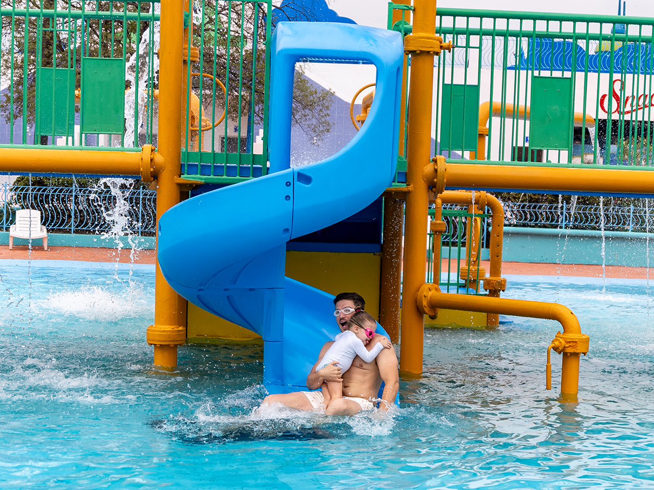 La zona de Splash cuenta con chapoteaderos, baños y cambiadores frente a los chapoteaderos, puesto de snacks y áreas de sombreado.