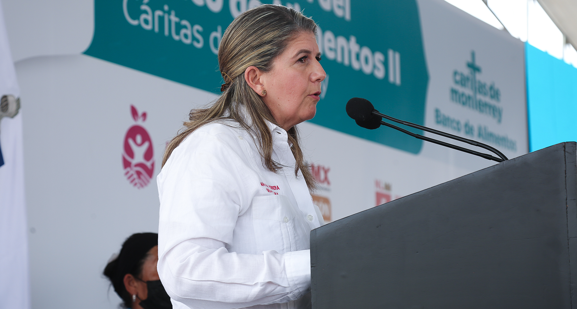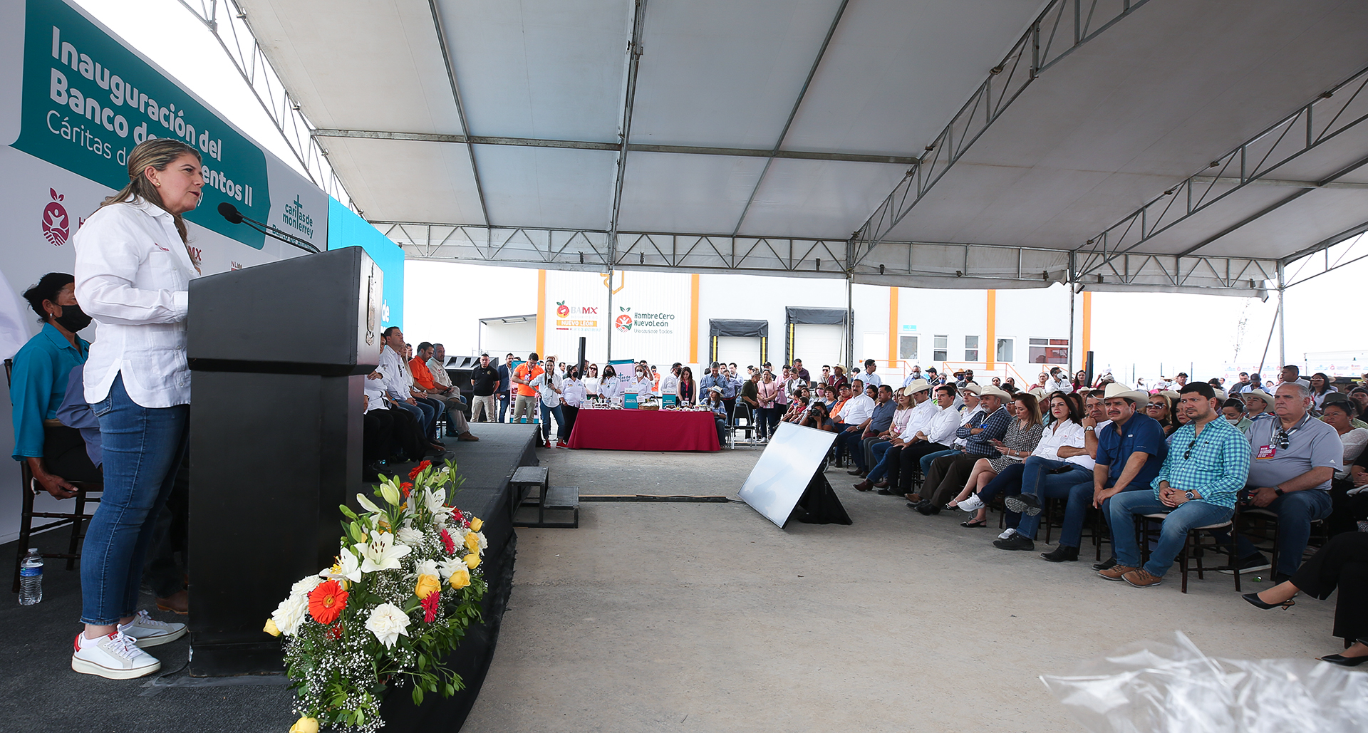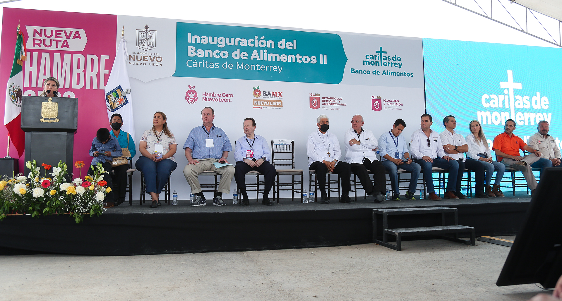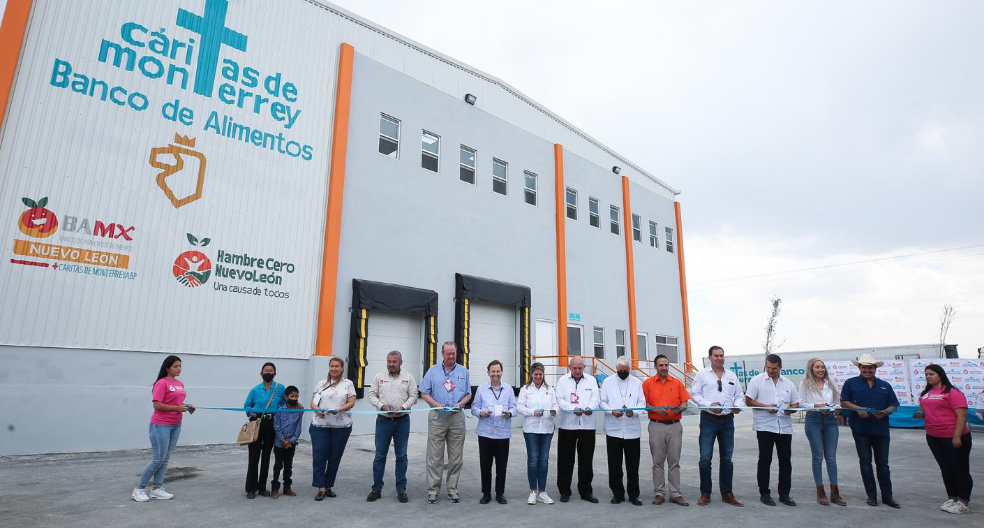 El corte de listón y develación de placa, estuvo a cargo de Martha Herrera, Secretaria de Igualdad e Inclusión; Enrique Gómez Junco; Presidente del Banco de Alimentos de Cáritas de Monterrey; Jimmy Colyer, Presidente de Cáritas de Monterrey A.B.P; Rogelio Cabrera, Arzobispo de Monterrey, quien bendijo el lugar; Marco González, Secretario de Desarrollo Regional, entre otros funcionarios.