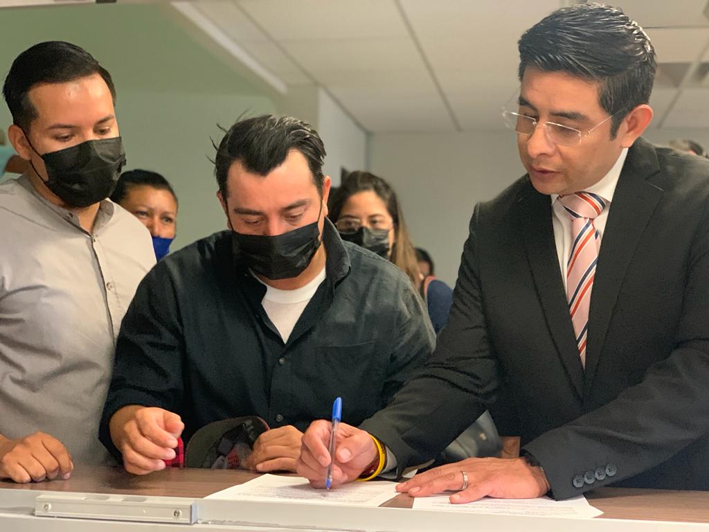 El Secretario del Trabajo de Nuevo León, Federico Rojas Veloquio; y el Director General del Centro de Conciliación, Daniel González Gaytán, fueron testigos de la primera solicitud que ingresó al Centro de Conciliación Laboral a las 09:22 horas, lo que dio inicio al nuevo Sistema de Justicia Laboral en la entidad.