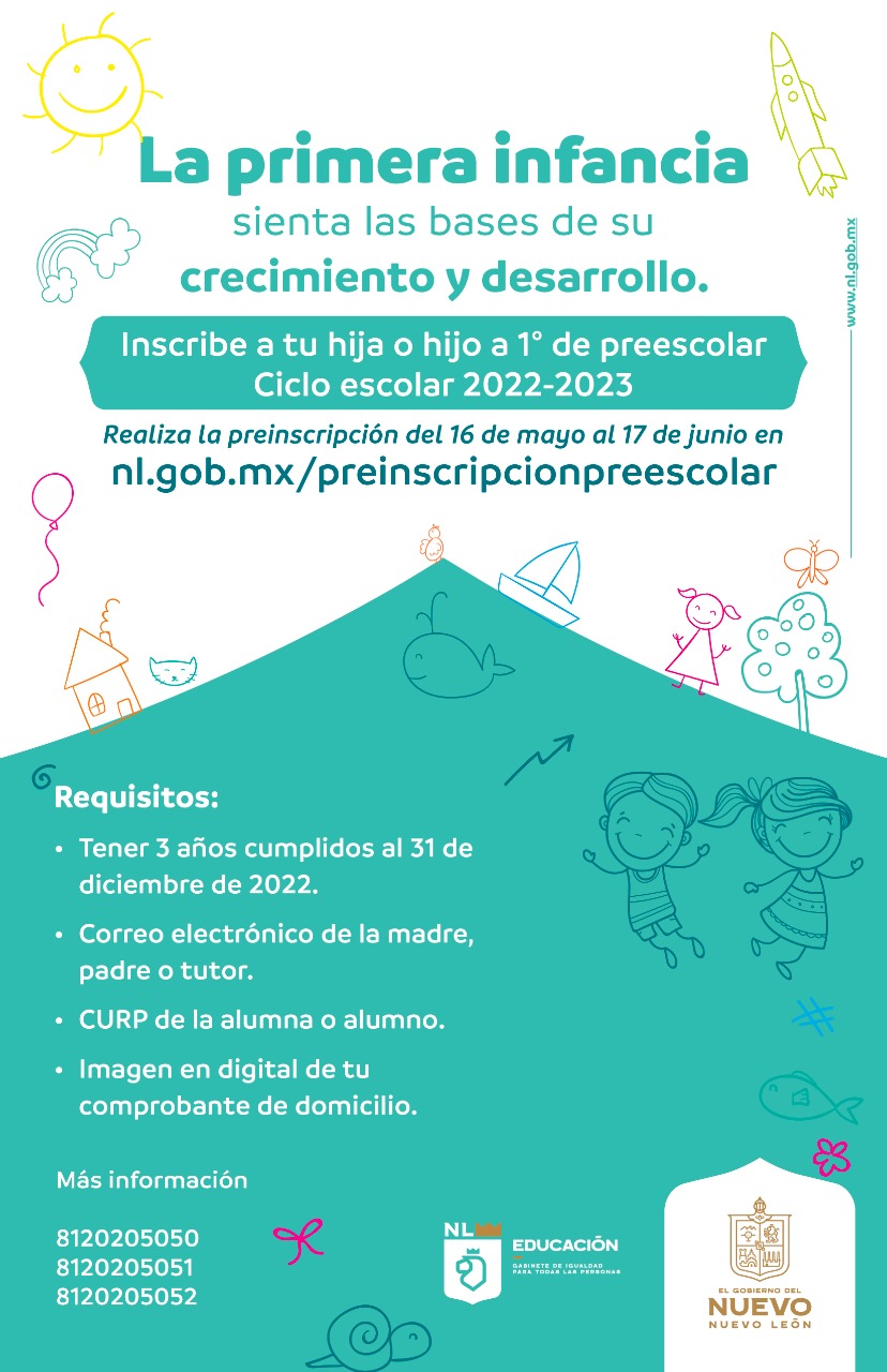 Como parte de las acciones para dar atención educativa desde la primera infancia, la Secretaría de Educación de Nuevo León informa que del 16 de mayo al 17 de junio del 2022, se realizará en línea el proceso de preinscripción para cursar el primer grado de preescolar del ciclo escolar 2022-2023.