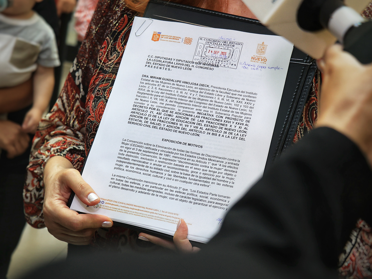 Monterrey, Nuevo León.- La Dra. Miriam Hinojosa Dieck, presidenta ejecutiva del Instituto Estatal de las Mujeres entregó este miércoles en la Oficialía de Partes del Congreso del Estado la iniciativa de ley Gestión Ginecológica a lo Largo del Ciclo de Vida.