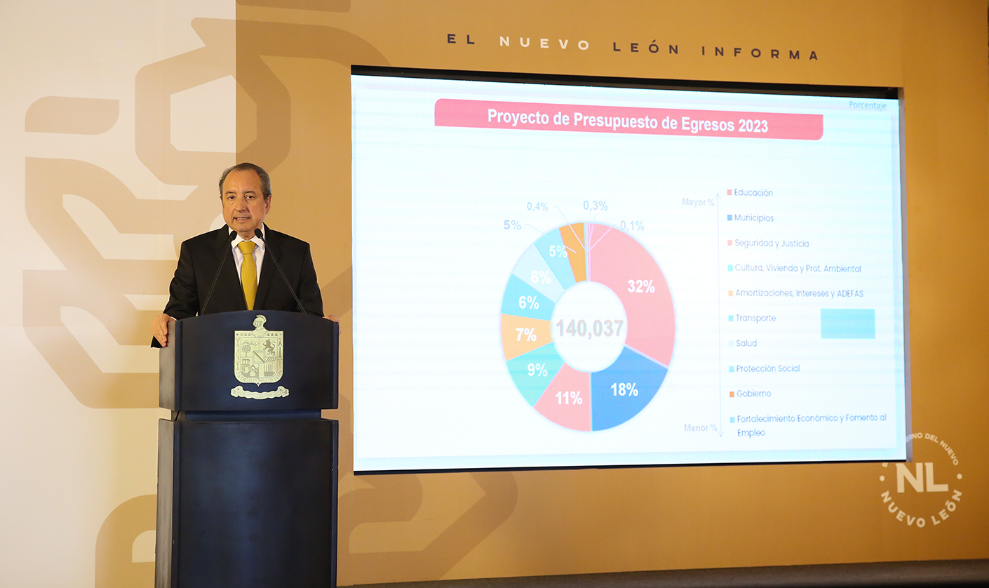 El Proyecto de Presupuesto de Egresos para 2023 considera una inversión total de 24 mil 549 millones de pesos, 56 por ciento más que el año pasado, anunció el Secretario de Finanzas y Tesorero General del Estado, Carlos Garza Ibarra. Las prioridades para este año son seguridad, educación, salud y movilidad.