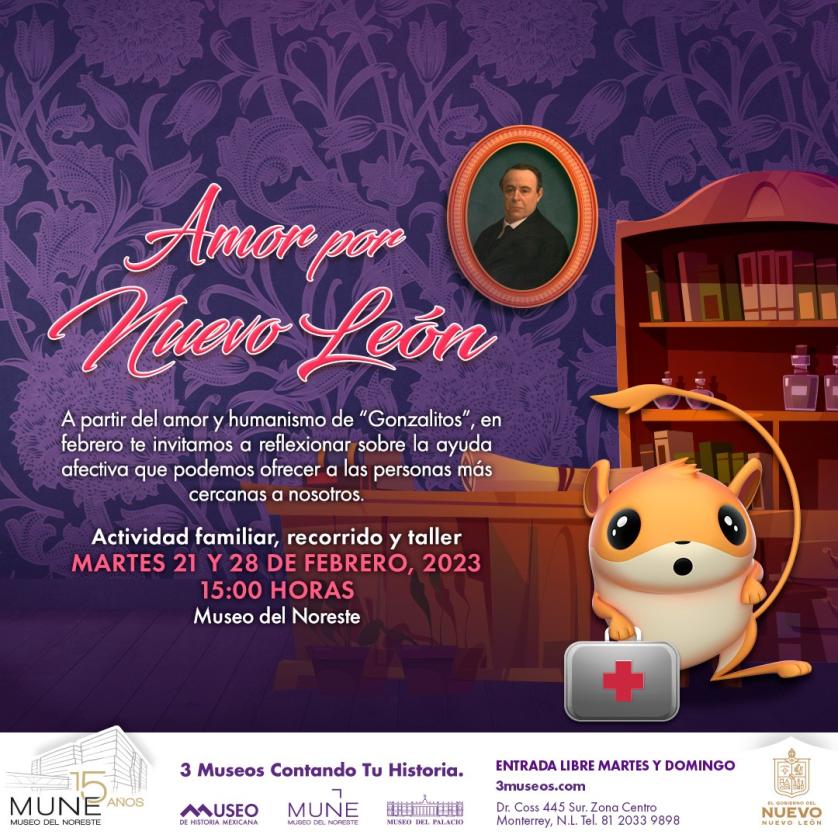 Monterrey, Nuevo León.- El Museo del Noreste invita a las familias nuevoleonesas a participar en el taller “Amor por Nuevo León” para celebrar el aniversario 210 del Dr. José Eleuterio González, Gonzalitos, uno de los filántropos más destacados de la entidad, los martes 21 y 28 de febrero a las 15:00 horas.