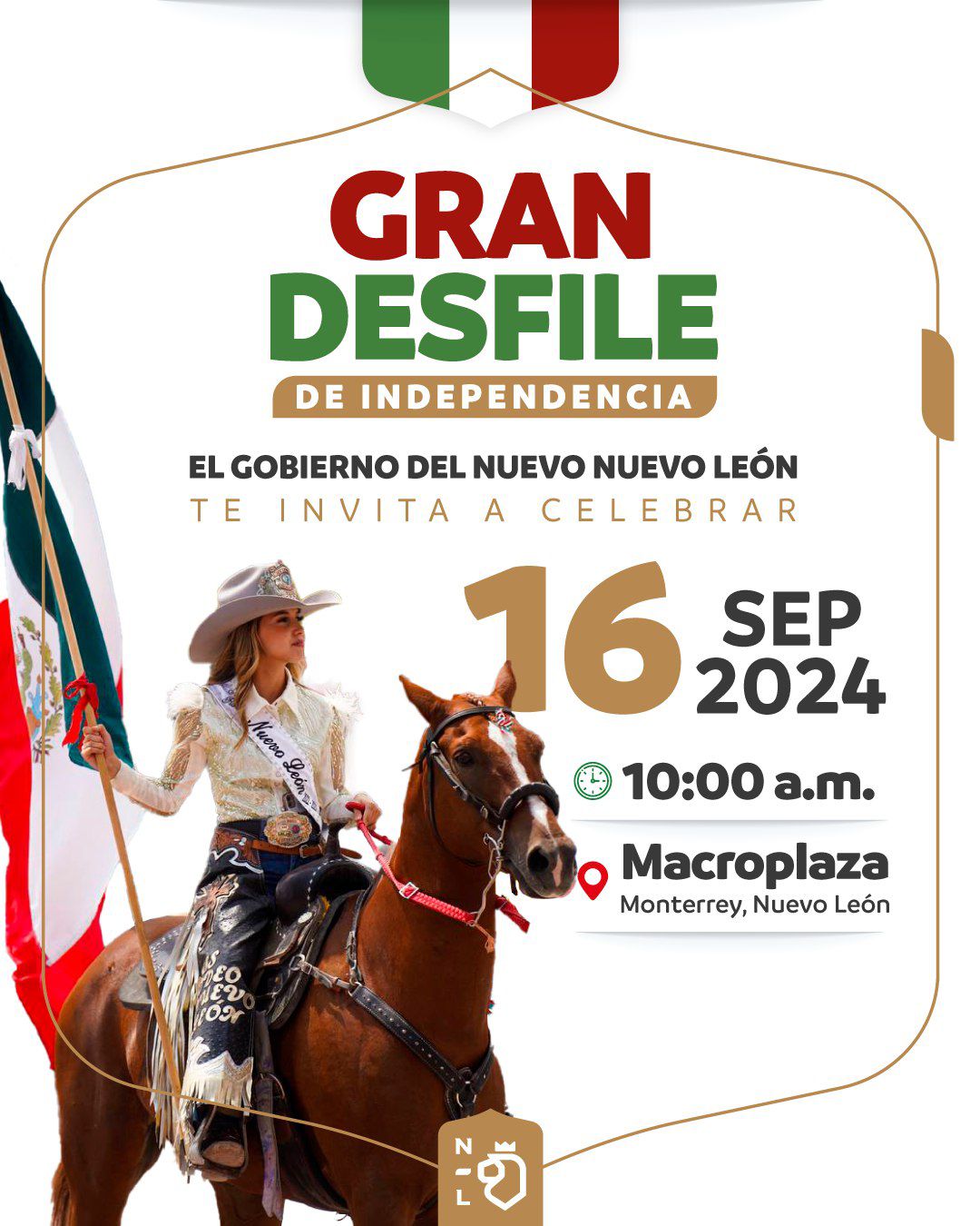 Monterrey, Nuevo León.- El Gobierno de Nuevo León invita a la ciudadanía al Gran Desfile de Independencia, que se realizará el próximo 16 de septiembre.