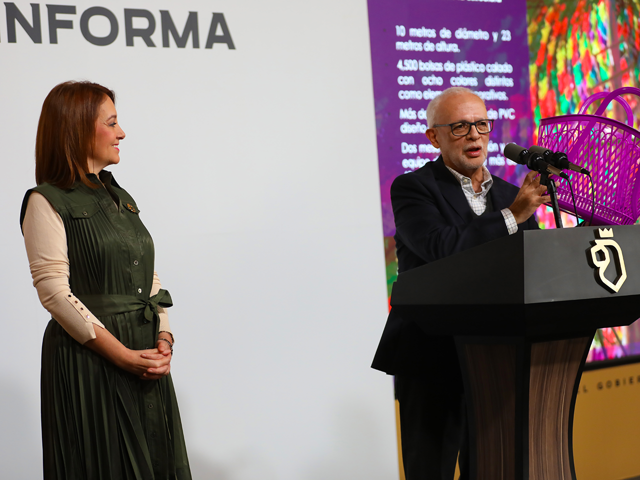 El director del Museo explicó que la creación del pino en donde trabajaron más de 60 personas, estuvo a cargo del artista Sergio Rodríguez y consta de 4 mil 500 canastas de plástico de diferentes colores; 2 mil móviles de PVC como espejos, además de luces. Asimismo tiene 10 metros de diámetro y 23 metros de altura.