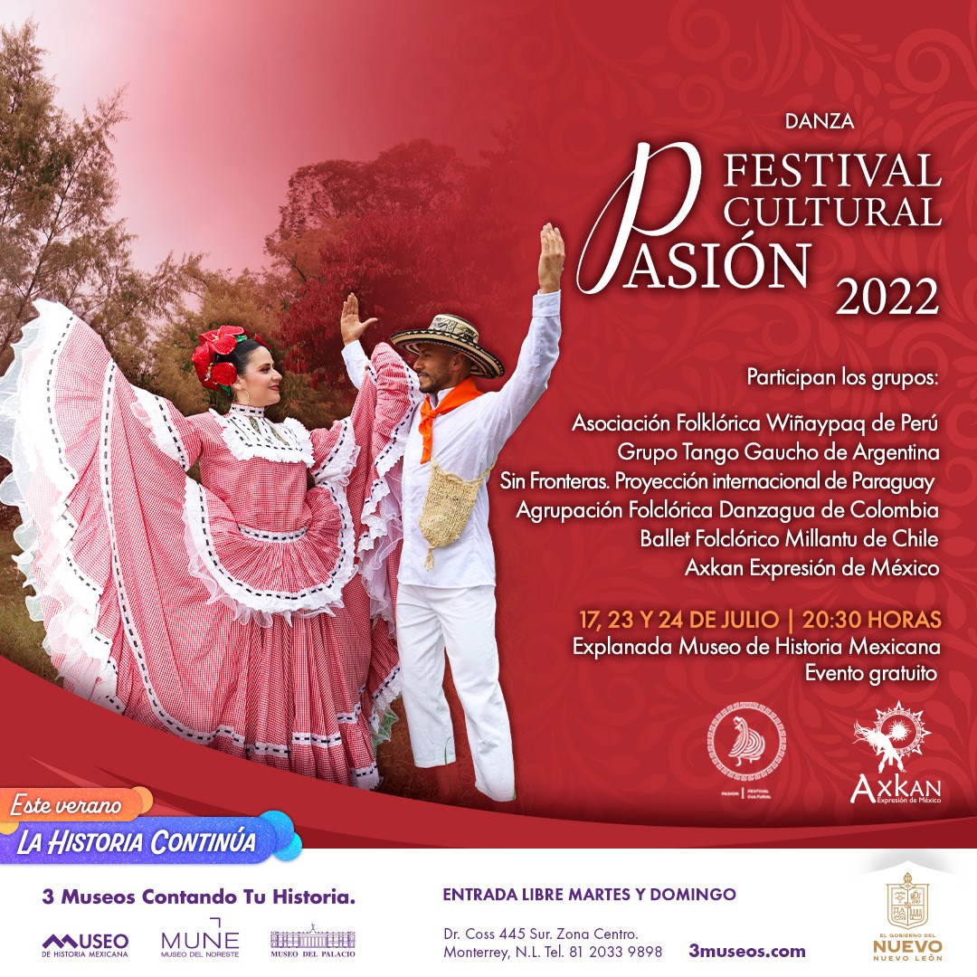 Bailarines de Perú, Argentina, Colombia, Chile y Paraguay estarán presentes en la explanada del Museo de Historia Mexicana para mostrar el amor por su cultura en el Festival Cultural Pasión 2022, que se realizará los días 17, 23 y 24 de julio.