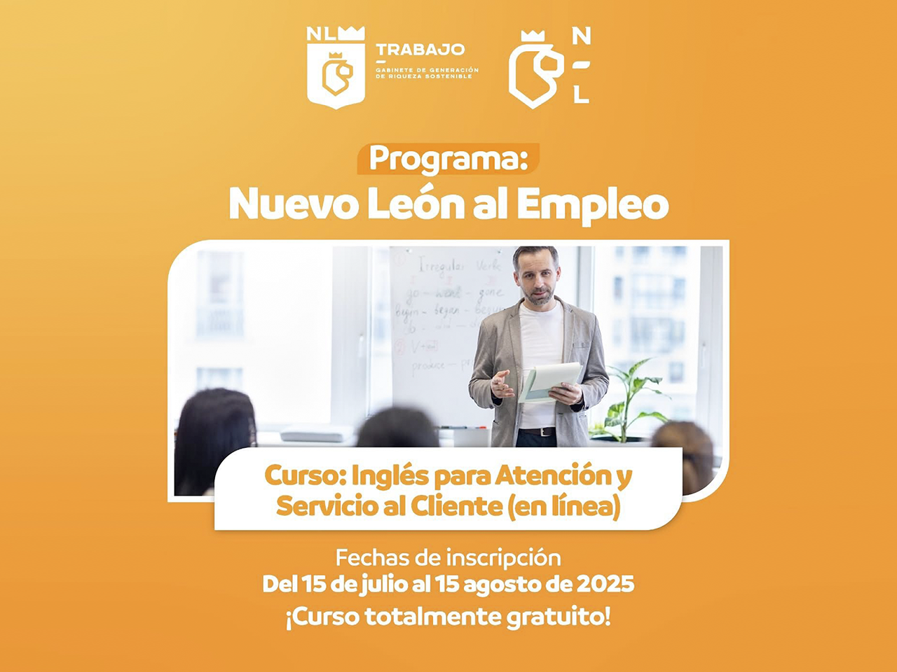 Las inscripciones están abiertas del 15 de julio al 15 de agosto, y pueden realizarse directamente en línea a través del siguiente enlace: https://cutt.ly/nuevoleonalempleo-ingles.