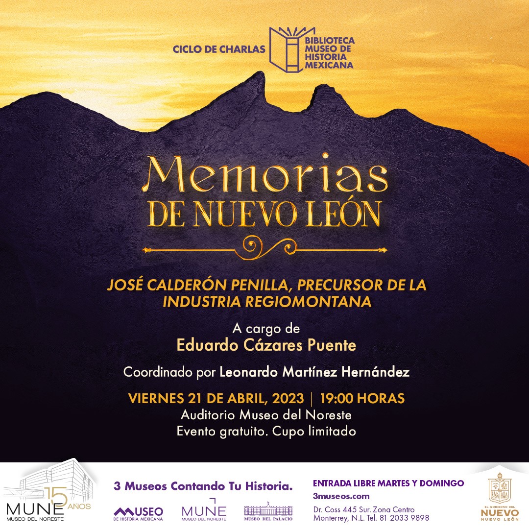José Calderón Penilla, precursor de la industria regiomontana será abordado por Eduardo Cázares Puente, el 21 de abril a las 19:00 horas en el Auditorio del Museo del Noreste, con entrada libre para todo el público interesado, si desea más información puede ponerse en contacto a través de las redes sociales de 3 Museos.