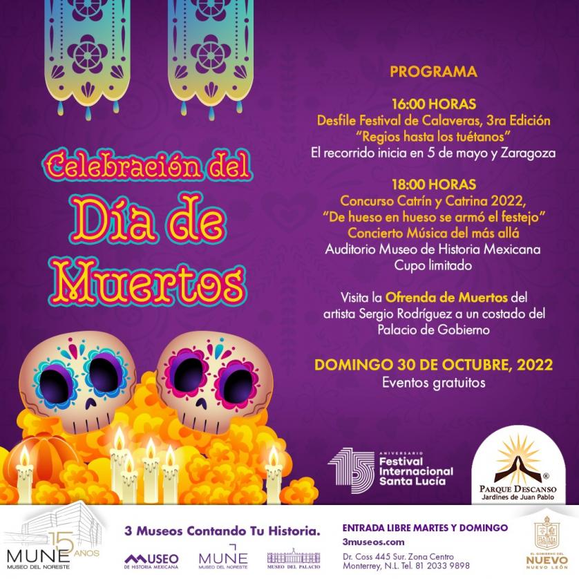 Las familias nuevoleonesas podrán celebrar el Día de Muertos con un gran espectáculo que conjunta el Desfile de Calaveras con personajes populares en vistosos carros alegóricos, el concurso de Catrín y Catrina 2022. De Hueso en hueso se armó el festejo, la ofrenda monumental del artista Sergio Rodríguez. Un festejo que llenará las calles de catrines y catrinas el domingo 30 de octubre a partir de las 16:00 horas.