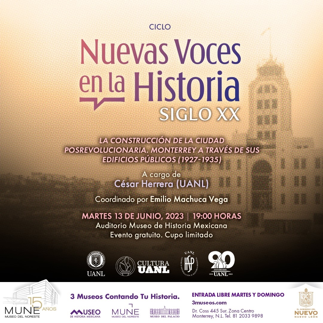 El ciclo inicia el 13 de junio a las 19:00 horas con la participación Pedro César Herrera Silva con el tema de La construcción de la ciudad posrevolucionaria. Monterrey a través de sus edificios públicos (1927-1935), una investigación sobre los principales edificios públicos construidos en Monterrey durante las primeras décadas del siglo XX.