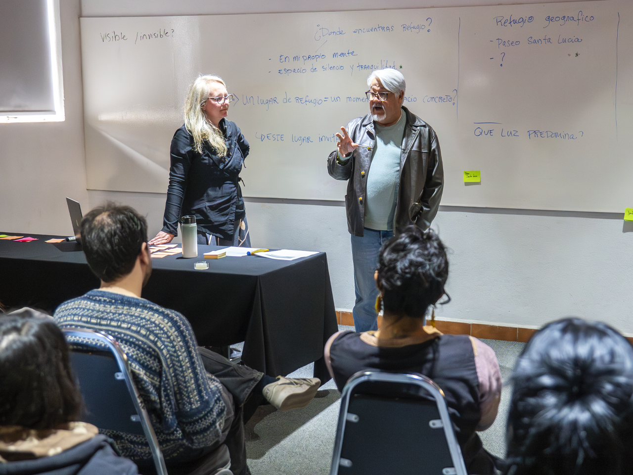 “Myriam va a estar aquí con nosotros durante tres meses, la Adolfo Prieto va a ser su casa. En el proceso que nos está presentando Myriam, el más importante, es crear lazos y crear un intercambio tangible entre nosotros, estoy seguro de que la presencia de ella va a dejar aquí ideas, va a generar argumentos, posturas estéticas y a su vez, a ella le van a generar eso”, destacó José Luis Solís Olivares, director de la EAP, al inicio del encuentro.