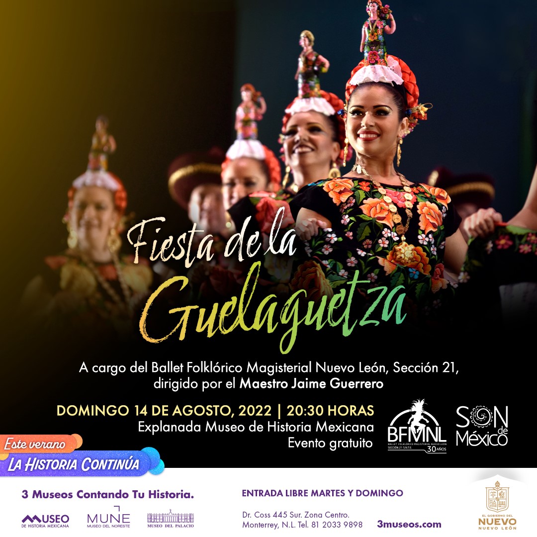 La Fiesta de la Guelaguetza, máxima expresión del folclor oaxaqueño, se presentará en la explanada del Museo de Historia Mexicana a cargo del Ballet Folklórico Magisterial Nuevo León, Sección 21, bajo la dirección del Mtro. Jaime Guerrero, el domingo 14 de agosto a las 20:30 horas.