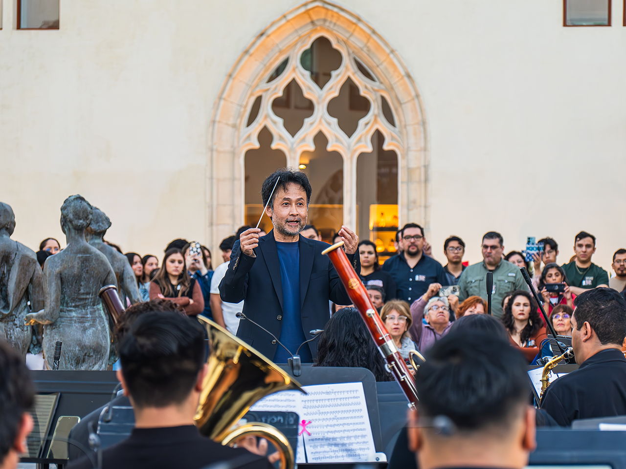 La participación de la Banda Sinfónica fue dirigida por el maestro Susumu Araki, con piezas como “Flourish for wind band” de Ralph Vaughan Williams; “Voices of the Sky” de Samuel R. Hazo; “Abram’s Pursuit” de David Holsinger; “Earthdance” de Michael Sweeney y la “Festival Fanfare for Christmas” de John Wasson.