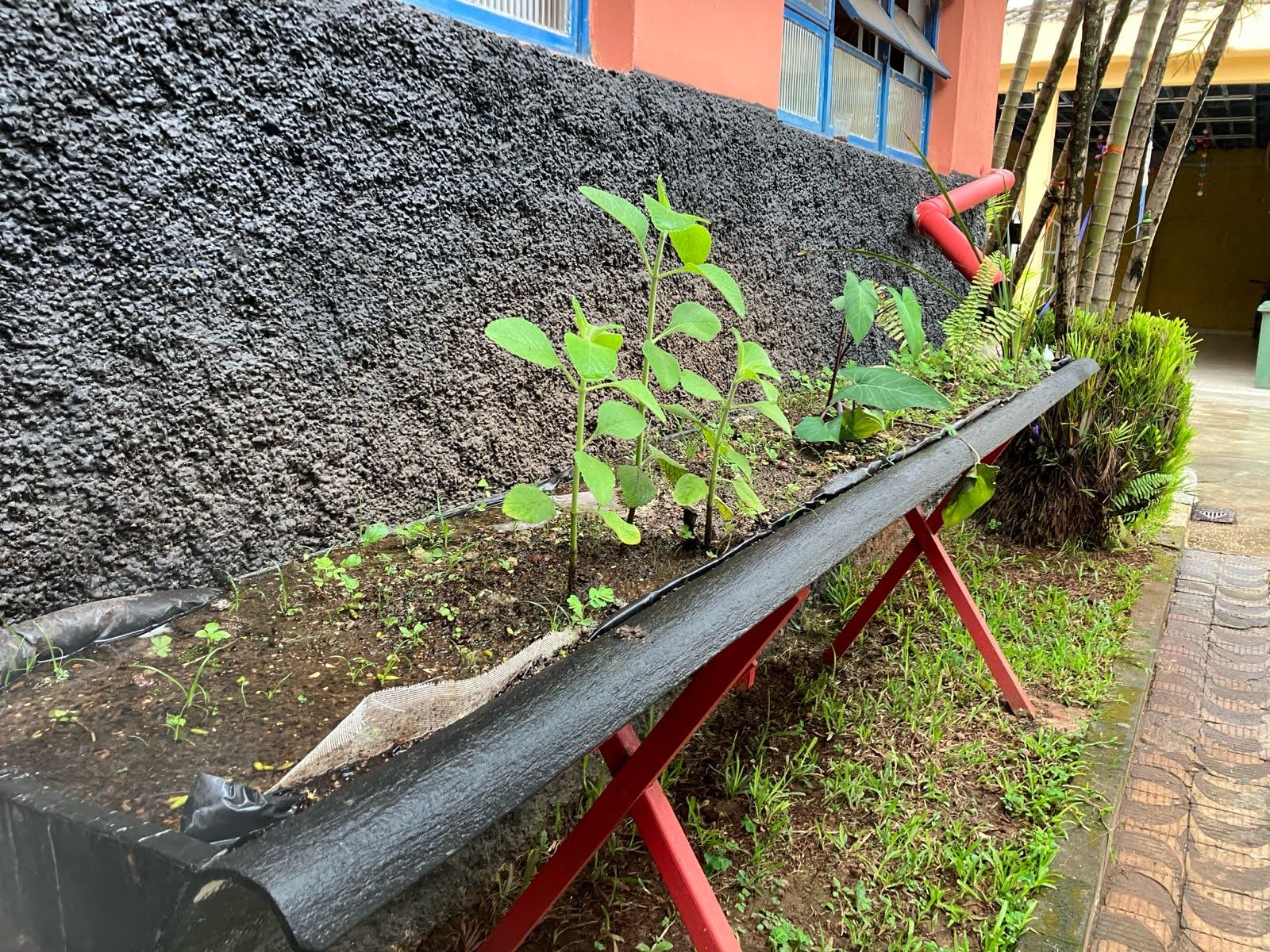 “Calhaflora” del Lab Procomum, de la ciudad de Santos, Brasil, que permite aprovechar el agua de lluvia para riego de plantas por medio de un sistema de captación hídrica hecho con tubería PVC.