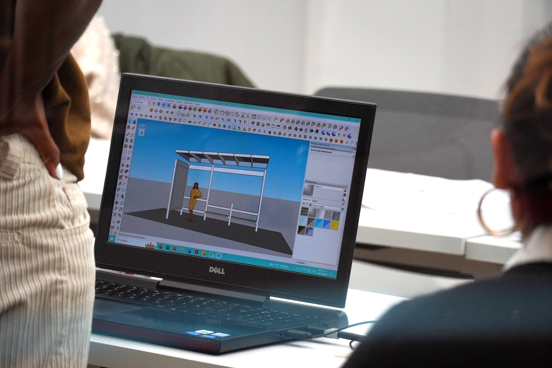 Otro es Parada adecuada, prototipo de Camille Young y Daniela Serrato, que consiste en una parada de autobús hecha con materiales de bajo costo que modifica el diseño estándar de las paradas actuales para proponer un transporte público más inclusivo.
