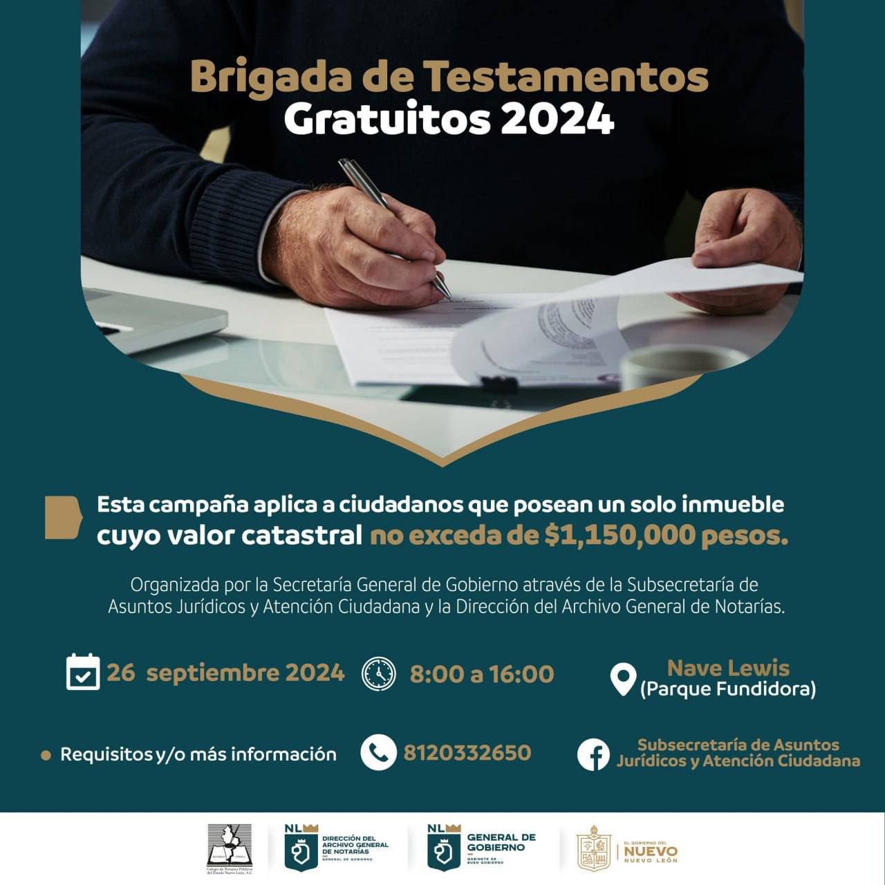 Monterrey, Nuevo León.- El Gobierno de Nuevo León reiteró el llamado a la ciudadanía a garantizar la seguridad jurídica para sus familias y dar trámite legal a los inmuebles que piensen dejar a sus deudos a través de la Brigada de Testamentos Gratuitos 2024.