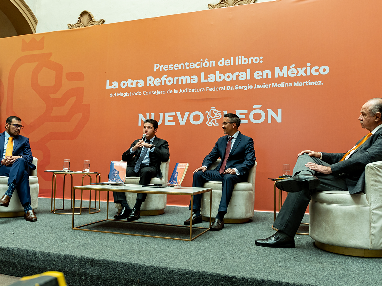 Monterrey, Nuevo León.- El Gobernador de Nuevo León, Samuel Alejandro García Sepúlveda participó este viernes en la presentación del libro “La otra reforma laboral en México” de Sergio Javier Molina Martínez, Consejero de la Judicatura Federal.