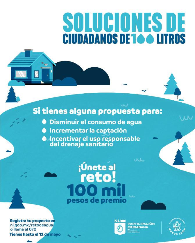 Registra tu proyecto en www.nl.gob.mx/retodeagua o marca al 070 las 24 horas, tienes hasta el 12 de mayo. Los proyectos ganadores se darán a conocer en el marco del evento de innovación “The Next Decade: Water Disruption”, a realizarse el 7 y 8 de junio en el Tecnológico de Monterrey.