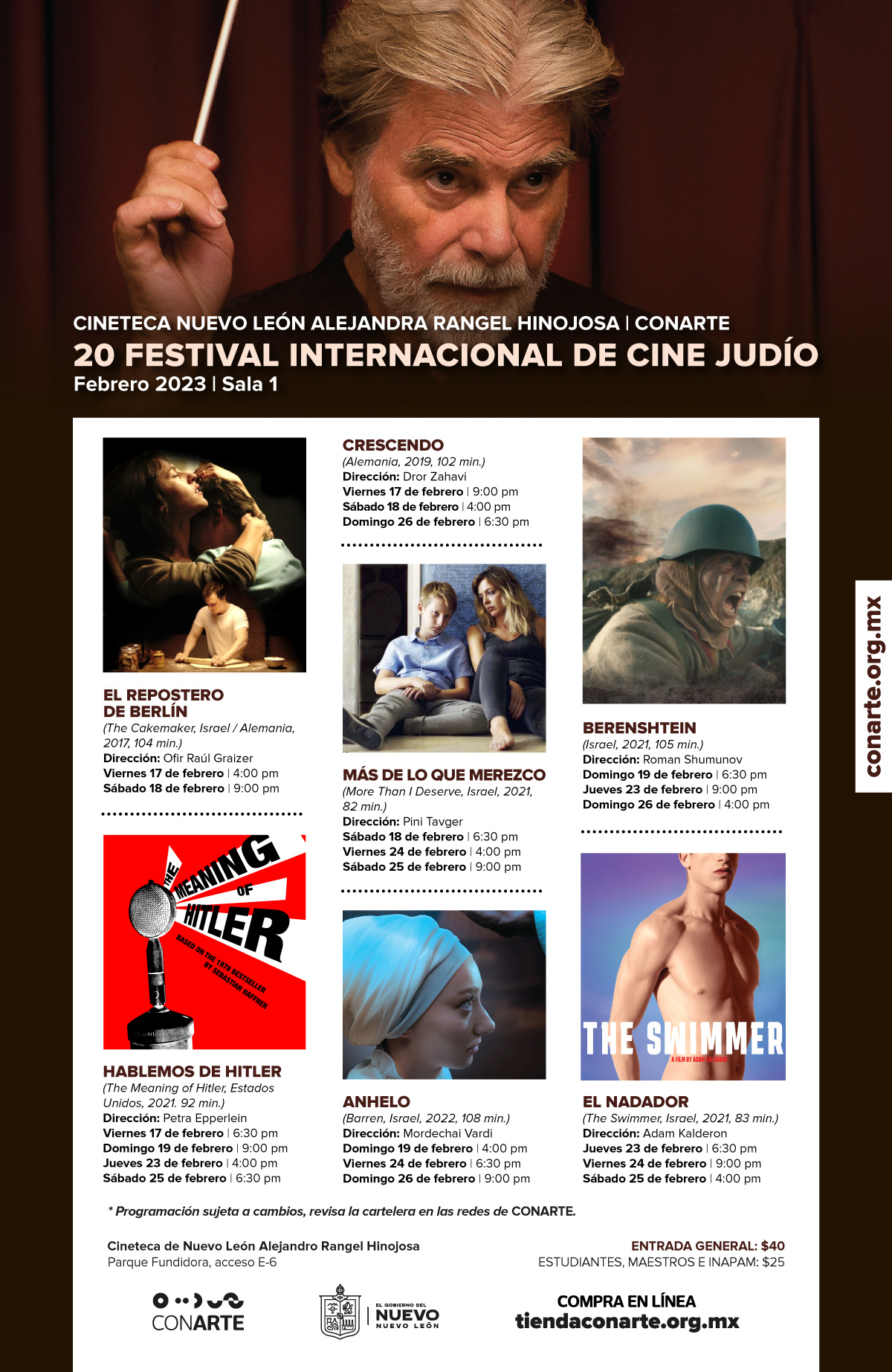 Serán siete las películas de este reconocido festival que, un año más, llega a la ciudad de Monterrey a través de los espacios de CONARTE con plurales propuestas de guiones y gran calidad en sus producciones; entre las que destacan: el documental “Hablemos de Hitler”, las películas “Anhelo”, “El nadador”, “Más de lo que merezco”, el docu-ficción “Berenshtein”, “El Repostero de Berlín” y “Crescendo”.