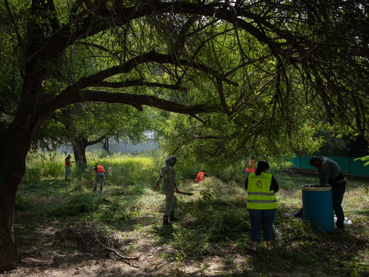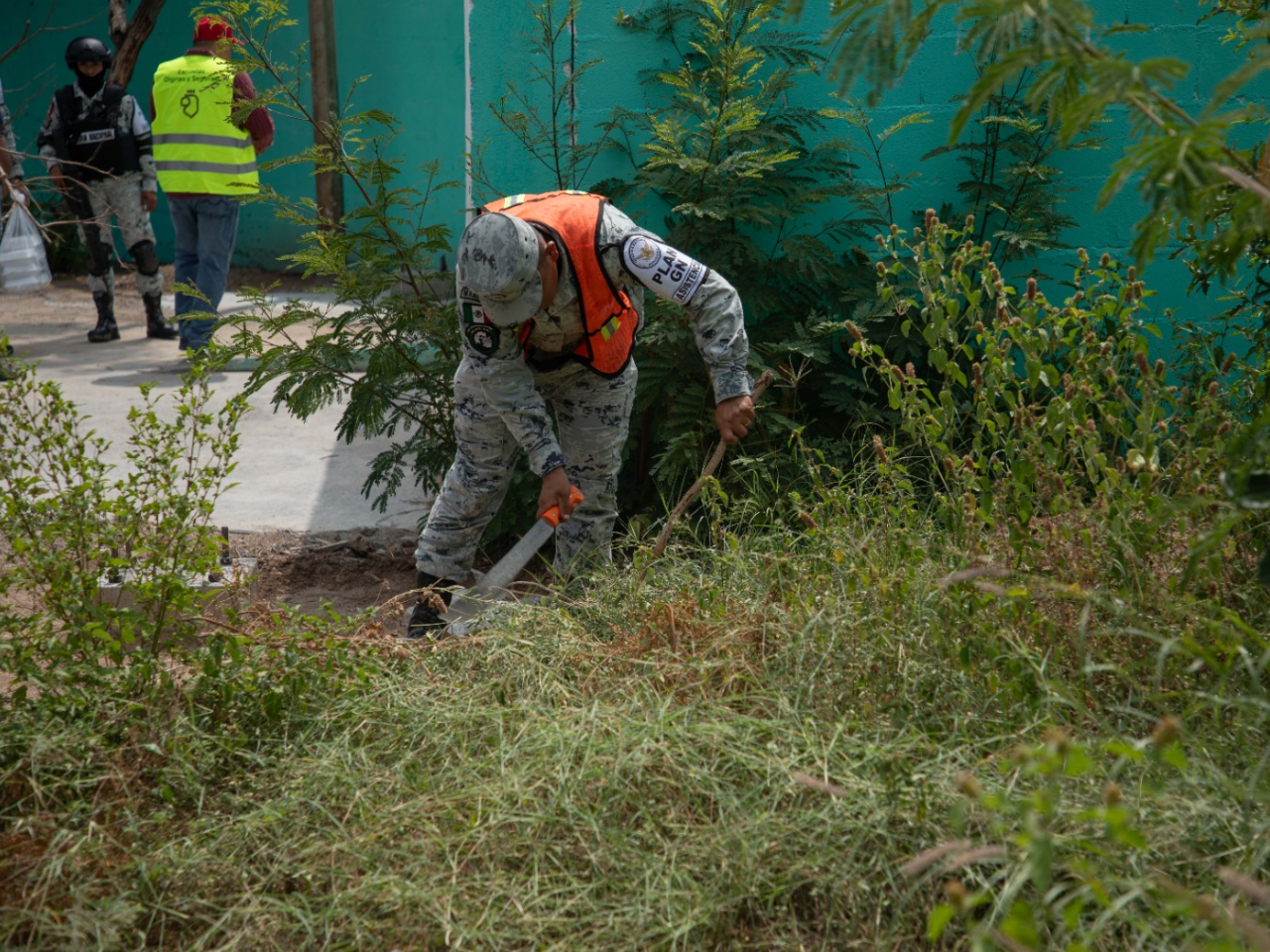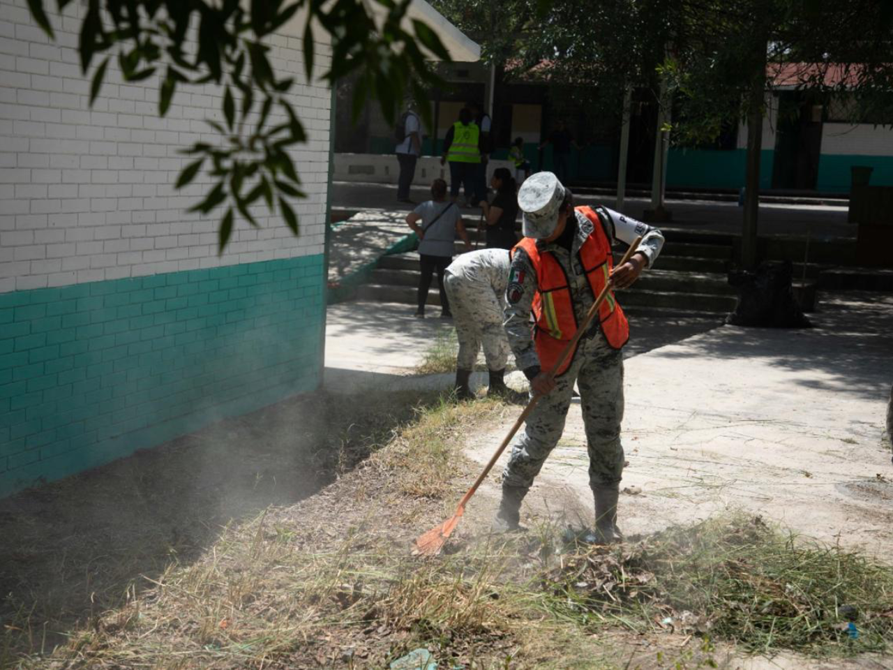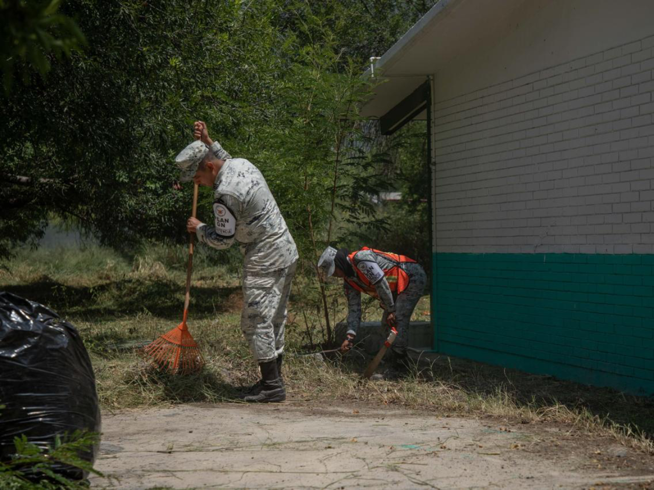 Entre las escuelas intervenidas se encuentran las Primarias Emiliano Zapata y Centenario de Juárez del municipio de Monterrey, entre otras, en donde la Guardia Nacional e integrantes de la comunidad educativa: directivos, docentes y personal de intendencia realizaron trabajos de limpieza general, retiro de maleza y reparaciones menores.