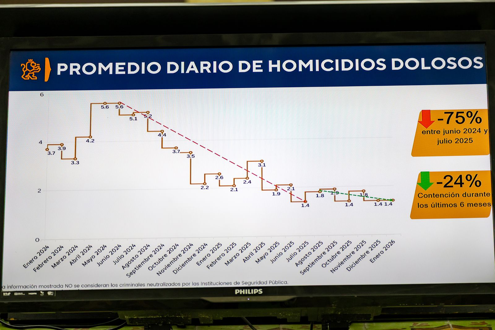 En el indicador de homicidios dolosos, durante el mes se ha registrado un promedio diario de 1.4 eventos, similar a los meses más bajos de 2025 y un 75% por debajo del promedio diario de homicidios que se registró en mayo y junio de 2024.