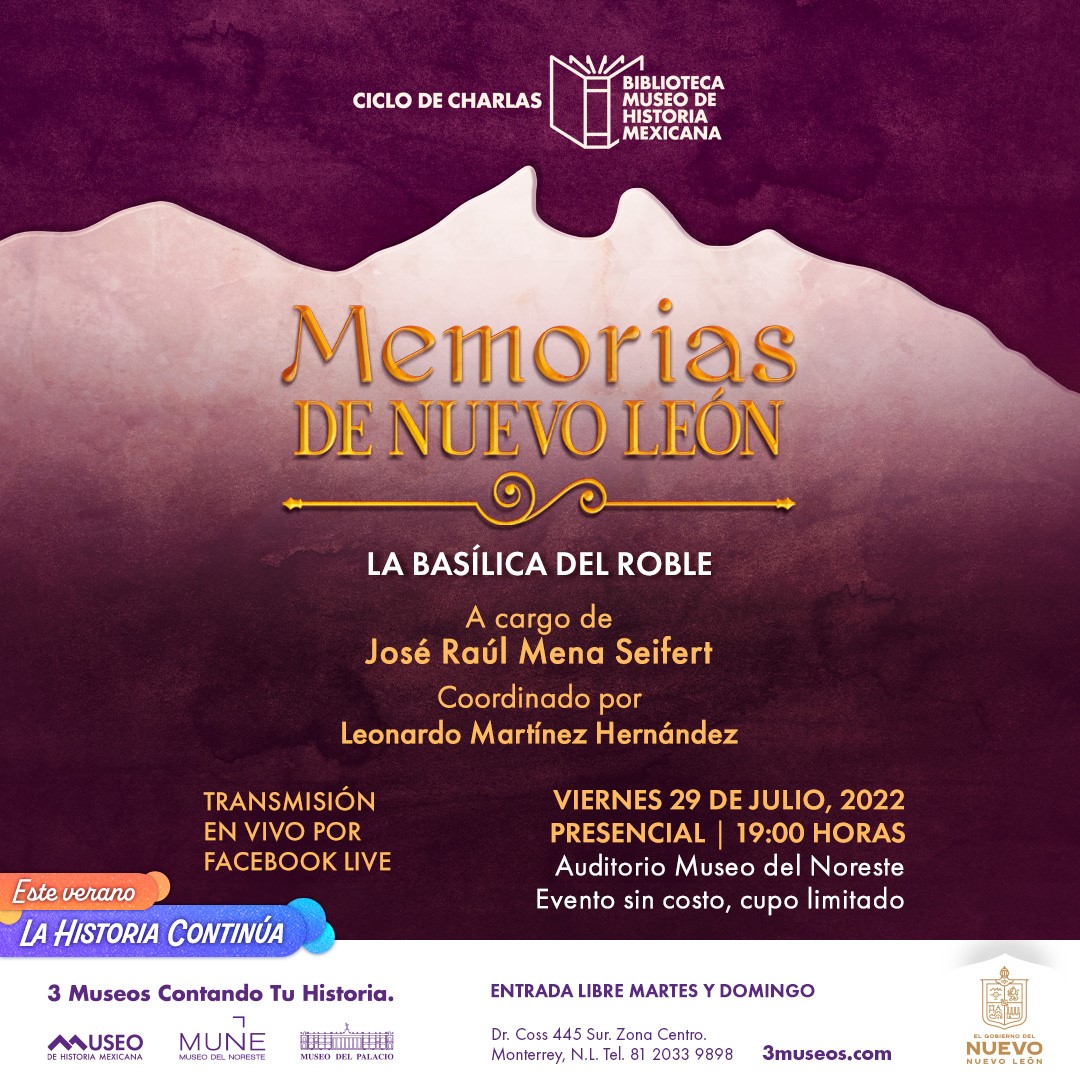 Memorias de Nuevo León sobre la historia de la Basílica del Roble a cargo del presbítero José Raúl Mena Seifert, se llevará a cabo el viernes 29 de julio a las 19:00 horas, en el Museo del Noreste. Si desea más información puede consultar www.3museos.com o ponerse en contacto a través de las redes sociales de 3 Museos.
