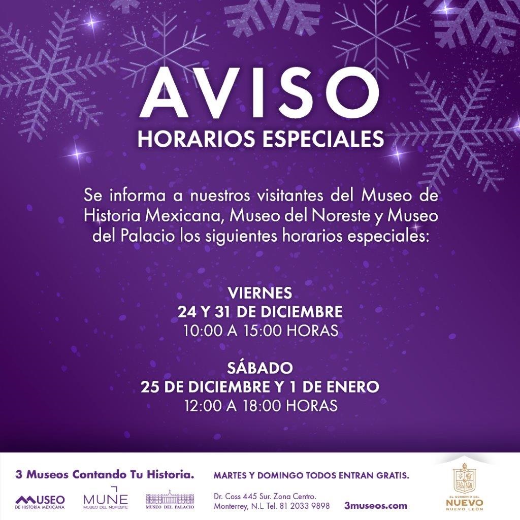 También para dar oportunidad a las personas de disfrutar de sus exposiciones temporales y permanentes se trabajará en horarios especiales el viernes 24 y 31 de diciembre de 10:00 a 15:00 horas, mientras que los días 25 de diciembre y 1 de enero, se ofrecerá el servicio de 12:00 a 18:00 horas.
