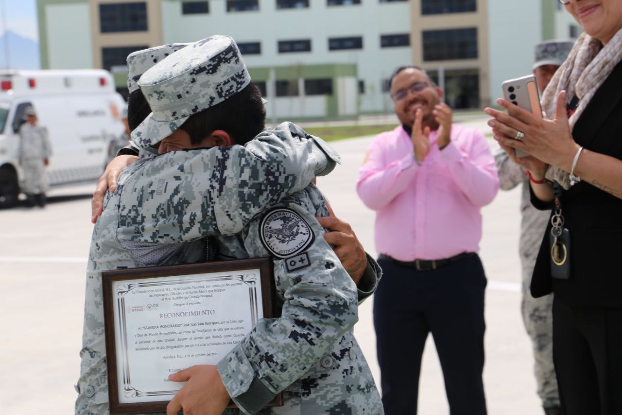 Monterrey, Nuevo León.- Los elementos de la unidad del Campo Militar No. 7 recibieron a Juanito de 12 años de edad, quien se encuentra albergado en el Centro DIF Capullos para brindarle la distinción de ser “GUARDIA HONORARIO”.