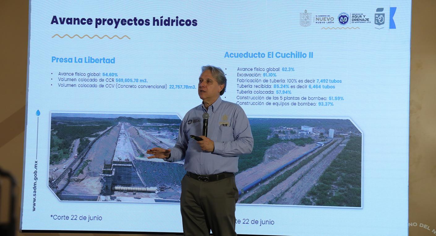A la par, la construcción e incorporación de agua de los grandes proyectos hídricos, vendrá a reforzar el abasto del estado y ayudará a tener una buena administración de las fuentes de abastecimiento. El Acueducto El Cuchillo II registra un avance físico global del 62.3%, en excavación lleva 91.10%, fabricación de tubería 100%, tubería recibida 85.24%, tubería colocada 57.94%, plantas de bombeo 51.59% y los equipos de bombeo van al 93.57%. En tanto, la Presa La Libertad tiene un avance físico global del 54.60%, se han colocado 569,605.78 m³ de concreto compactado con rodillo y 22,757.78 m³ de concreto convencional en la cortina del embalse.