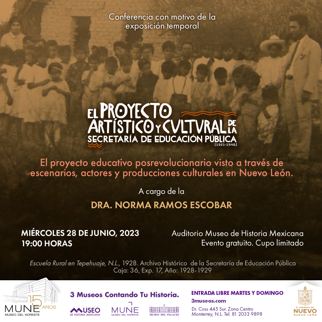 La conferencia El proyecto educativo posrevolucionario visto a través de escenarios, actores y producciones culturales en Nuevo León con la Dra. Norma Ramos Escobar, será el miércoles, 28 de junio a las 19:00 horas en el Auditorio Museo de Historia Mexicana, la entrada es gratuita y el cupo limitado, para más información consulte la página www.3museos.com