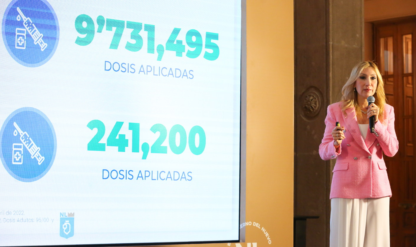 Alma Rosa Marroquín Escamilla, Secretaria de Salud en el estado destacó que hasta el momento, en Nuevo León se han aplicado cerca de 10 millones de dosis contra el Covid-19 a través de las diferentes estrategias de vacunación en la entidad, y exhortó a la población a acudir a los Centros de Salud o módulos habilitados para completar los esquemas de vacunación e incrementar la protección individual y la inmunidad colectiva.