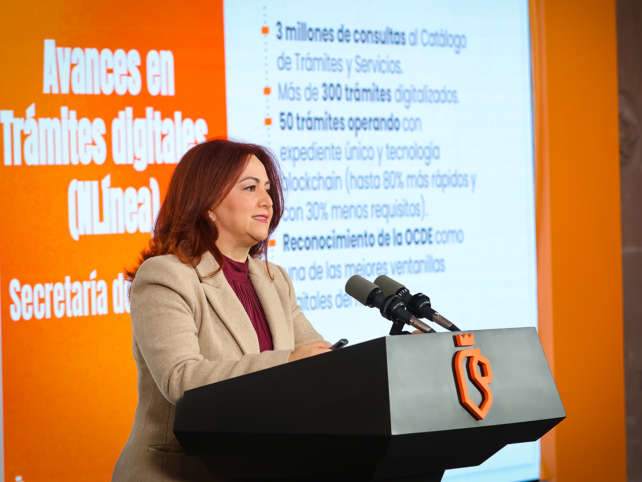 La plataforma NLínea, desarrollada por la Secretaría de Economía en coordinación con Mejora Regulatoria y Administración, superó 3 millones de consultas, ofrece más de 300 trámites digitales, y ya cuenta con 50 procesos operando con blockchain, reduciendo en 80 por ciento los tiempos y en 30 por ciento los requisitos.