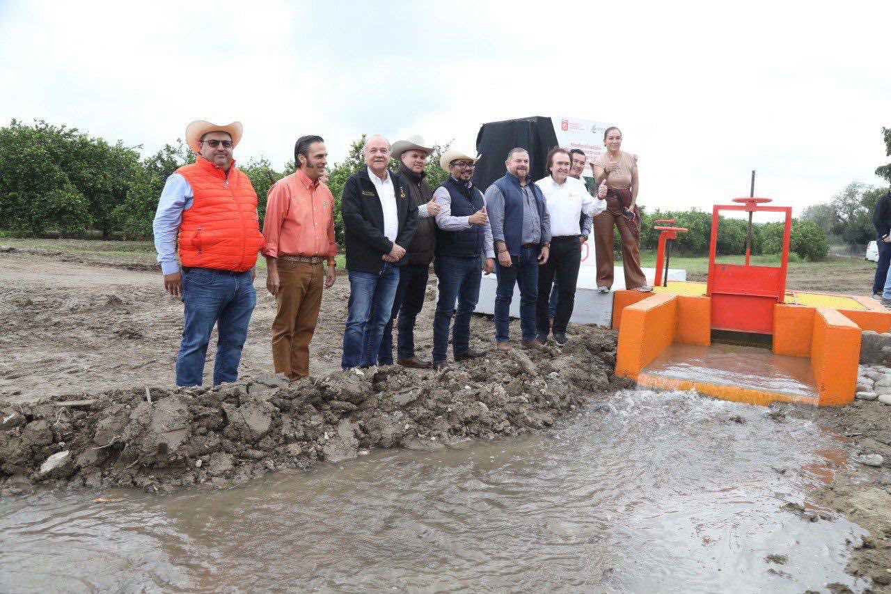 Previo a inauguración, Navarro Velasco aperturó la compuerta para iniciar el riego de huertos de cítricos, acompañado de Miguel Ángel Salazar, alcalde de Montemorelos; de Marco Antonio González, Secretario de Desarrollo Regional y Agropecuario; y de Luis Carlos Alatorre, Director General del Organismo Cuenca Rio Bravo, CONAGUA.