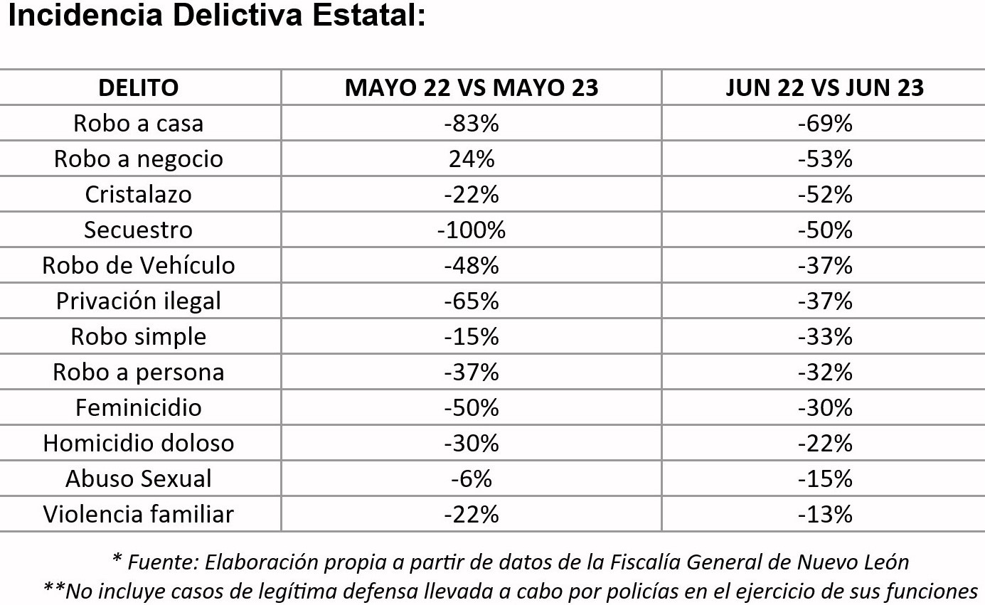 Nuevo León registra disminución en delitos durante mayo y junio de 2023