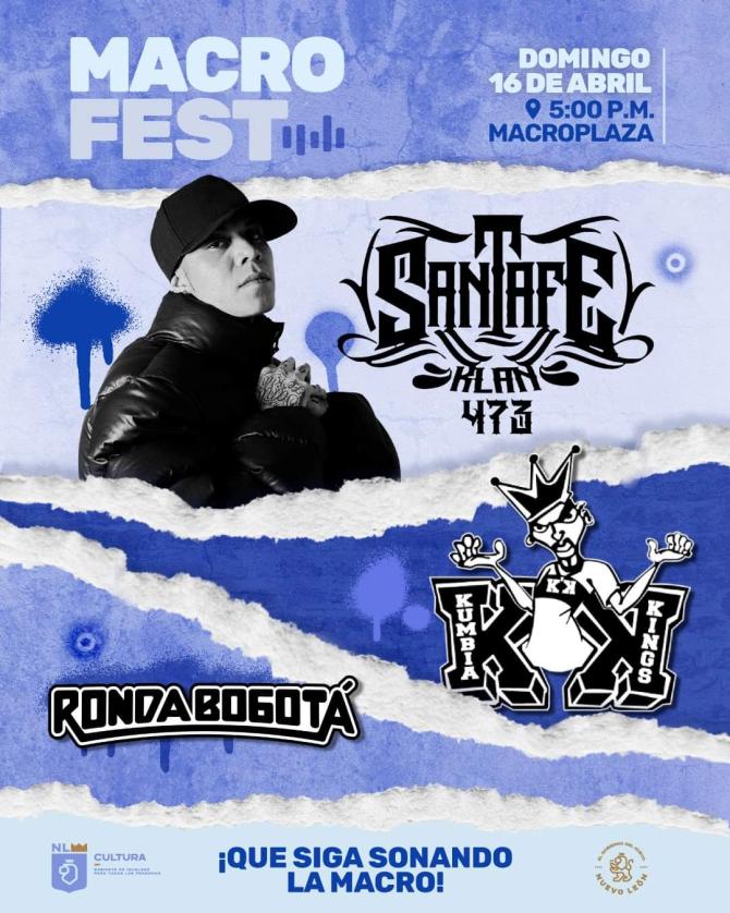 Nuevo León.- Tras la exitosa primera edición el pasado 5 de marzo con Los Ángeles Azules y otros talentos, nacionales y regionales, el Gobernador Samuel García Sepúlveda reveló en sus redes sociales los elencos invitados para el MacroFest del mes de abril, que se realizará gratuitamente el domingo 16 de abril: La Ronda Bogotá, los Kumbia Kings y Santa Fe Klan.