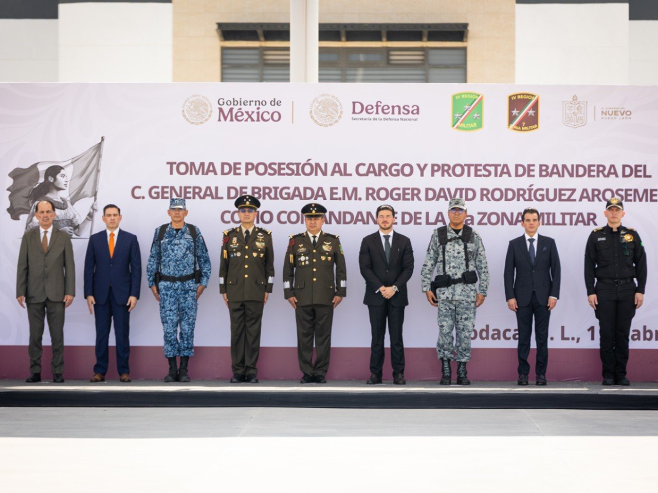 Tras asistir a la ceremonia de toma de posesión de los nuevos Comandantes de la Cuarta Región Militar, General Rubén Darío Díaz Esparza, y de la Séptima Zona Militar, General Roger David Rodríguez Arosemena, el Mandatario estatal dijo que Nuevo León es un Estado que no se detiene y exige resultados, razón por la cual se mantiene una estrecha relación de colaboración y trabajo entre la nueva Fuerza Civil y la Secretaría de la Defensa Nacional.