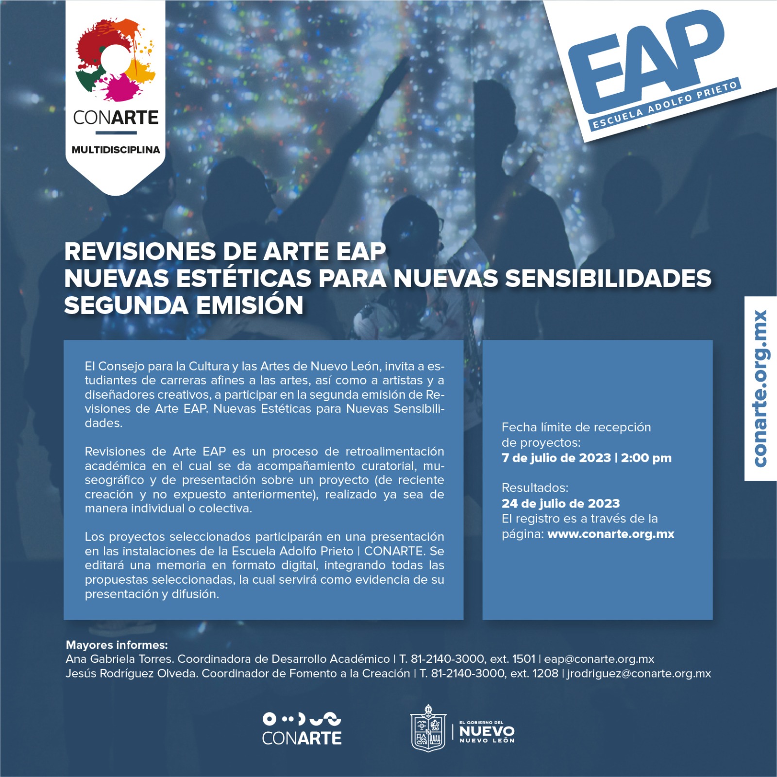 Para obtener mayores informes, se pueden comunicar con: Arissa Hernández Soto, responsable de Seguimiento a Programas Culturales/Académicos en la EAP | CONARTE al teléfono 812140 3000 ext. 1501 y al email: ahernandez@conarte.org.mx o bien con Jesús Rodríguez, coordinador de Fomento a la Creación de CONARTE al teléfono 812140 3000 ext. 1208 y al email: jrodriguez@conarte.org.mx
