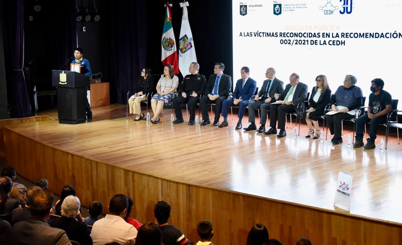 El acto de disculpas públicas y el reconocimiento de responsabilidad por violaciones graves a derechos humanos se llevó a cabo en presencia del Secretario General de Gobierno, Javier Navarro Velasco, las Presidentas de la CEDHNL, Olga Méndez Arellano; de la Comisión Ejecutiva Estatal de Atención a Víctimas, Cinthia Lucía Marín Montoya; del Consejo Ciudadano de Seguridad, Ana María Esquivel Hernández, el Comisario General de Fuerza Civil, Gerardo Escamilla Vargas; el Fiscal General de Justicia Gustavo Adolfo Guerrero Gutiérrez; el Presidente del Congreso del Estado Mauro Guerra; las víctimas sobrevivientes Jaime Santiago Margarito y Venancio Santiago Margarito; así como la Asociación Civil Zihuame Mochilla.