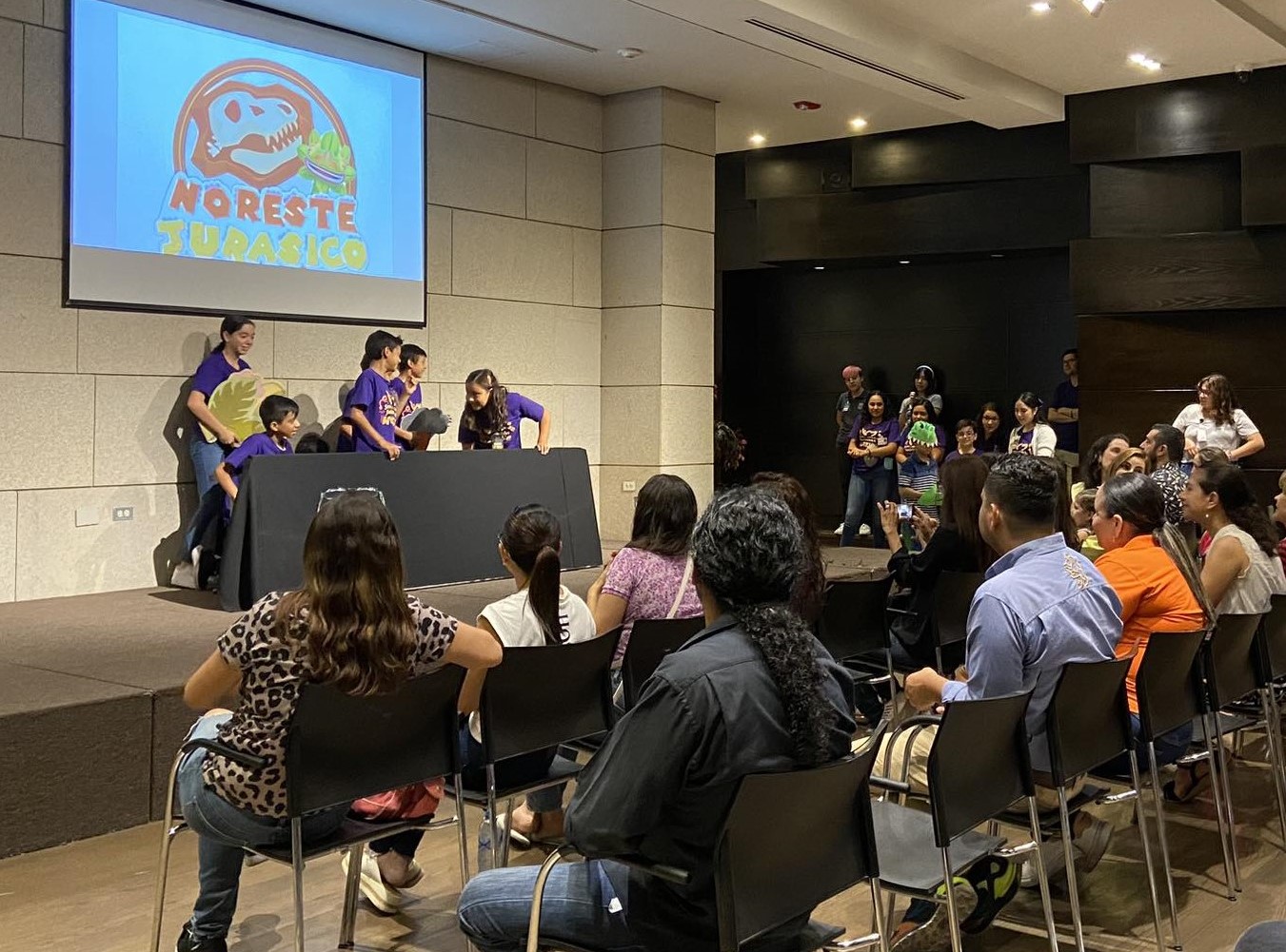 El siguiente grupo lo formaron las y los paleontólogos de 8 a 10 años, quienes ilustraron a los presentes sobre la Era Mesozoica ataviados con sombreros y chalecos explicaron la mítica figura del Monstruo de Aramberri, el enorme reptil marino encontrado en Formación La Casita al sur del estado; las cosas no quedaron ahí, de pronto en el escenario, sus herramientas: cámaras, cinta de medir, martillos y brochas, hicieron un baile frenético y divertido.