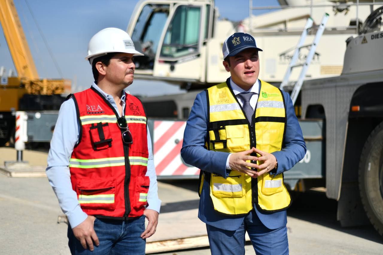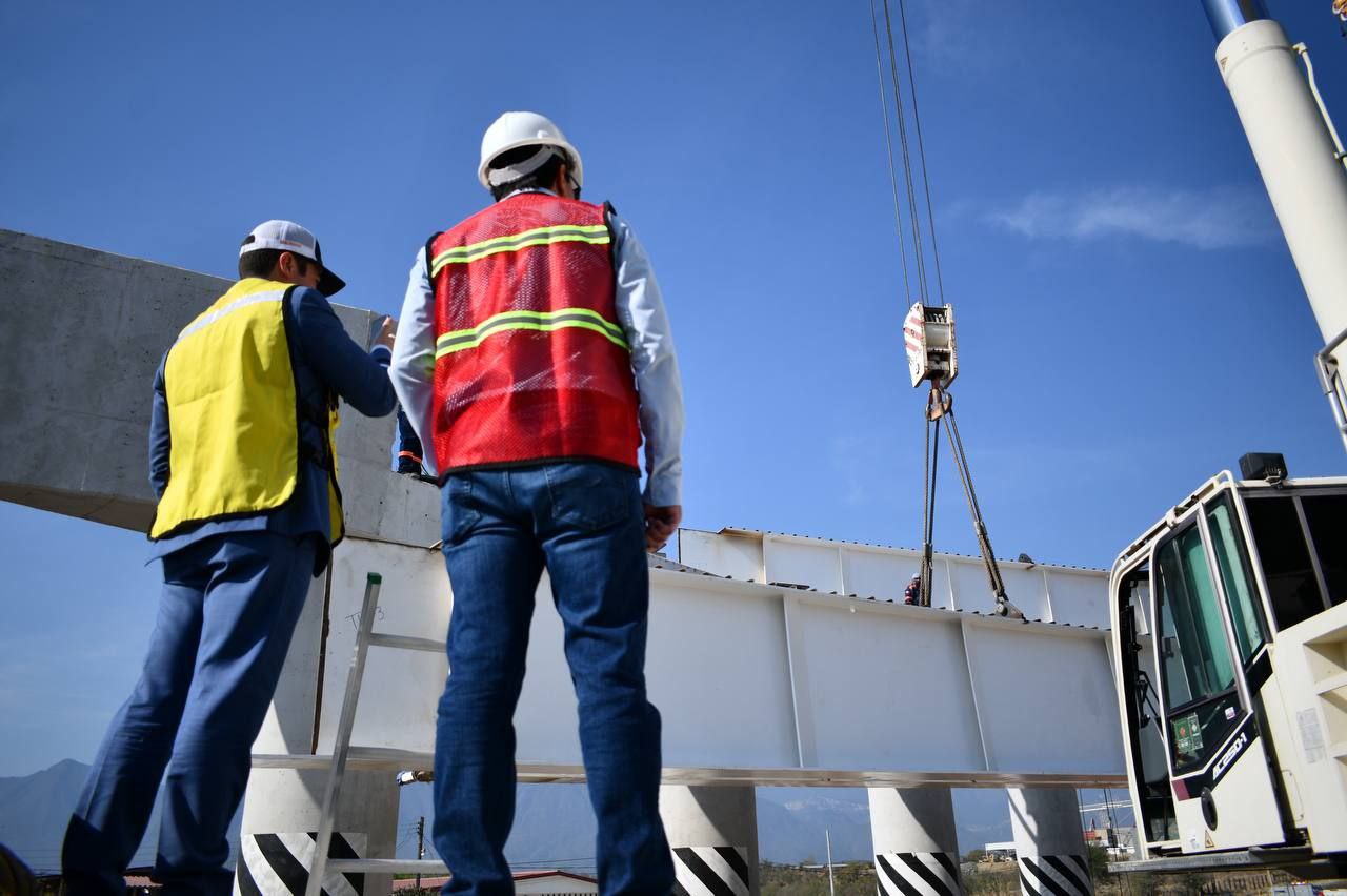Montemorelos, Nuevo León.- El Gobernador Samuel Alejandro García Sepúlveda supervisó este martes la colocación de los trabes en el entronque que conectará el Periférico del Área Metropolitana de Monterrey con la Carretera Nacional.