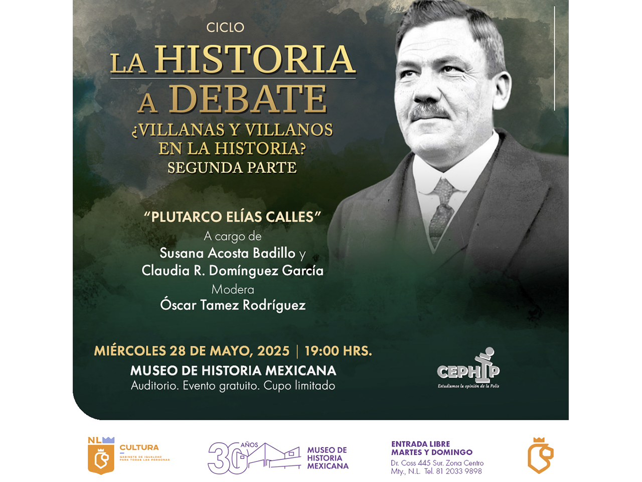 Historia a debate: ¿Villanas y Villanos en la Historia? Plutarco Elías Calles se llevará a cabo el miércoles 28 de mayo a las 19:00 horas en el Museo de Historia Mexicana. Llegue con tiempo. Para más información, consulte la página www.3museos.com