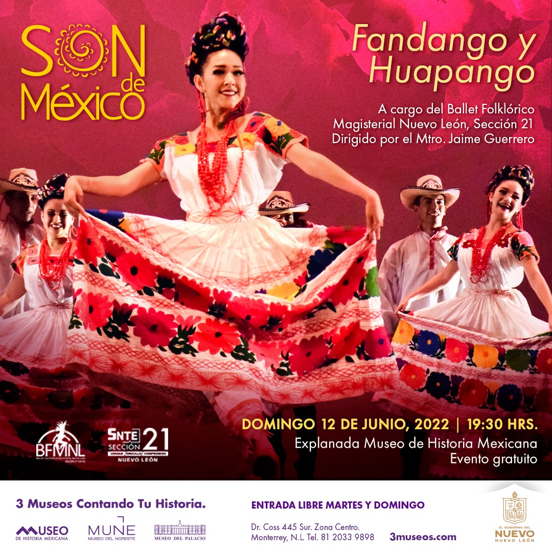 El fandango, con el incomparable colorido de las costas de Veracruz y Campeche, está marcado por sus raíces africanas y españolas, y la característica alegría mexicana, que estará presente en el programa Son de México: Fandango y Huapango del Ballet Folklórico Magisterial Nuevo León, Sección 21, bajo la dirección del maestro Jaime Guerrero.