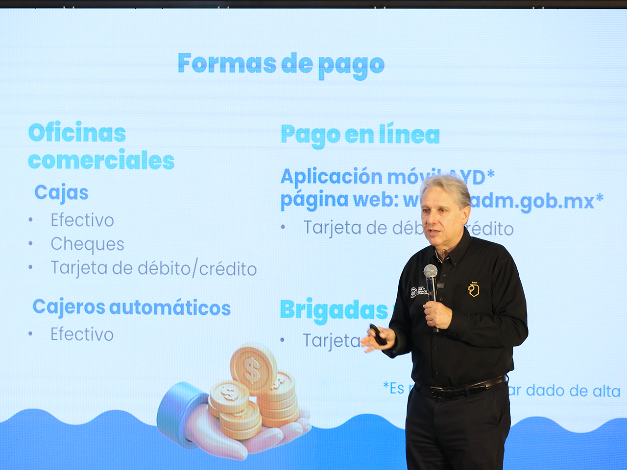 Explicó que la forma de pagos es: en oficinas comerciales a través de cheques, efectivo y con tarjeta de crédito o débito; en cajeros automáticos de AyD, solo efectivo; pago en Línea en la app de la paraestatal con tarjeta de crédito o débito; y en Brigadas Móviles con tarjeta de crédito o débito.