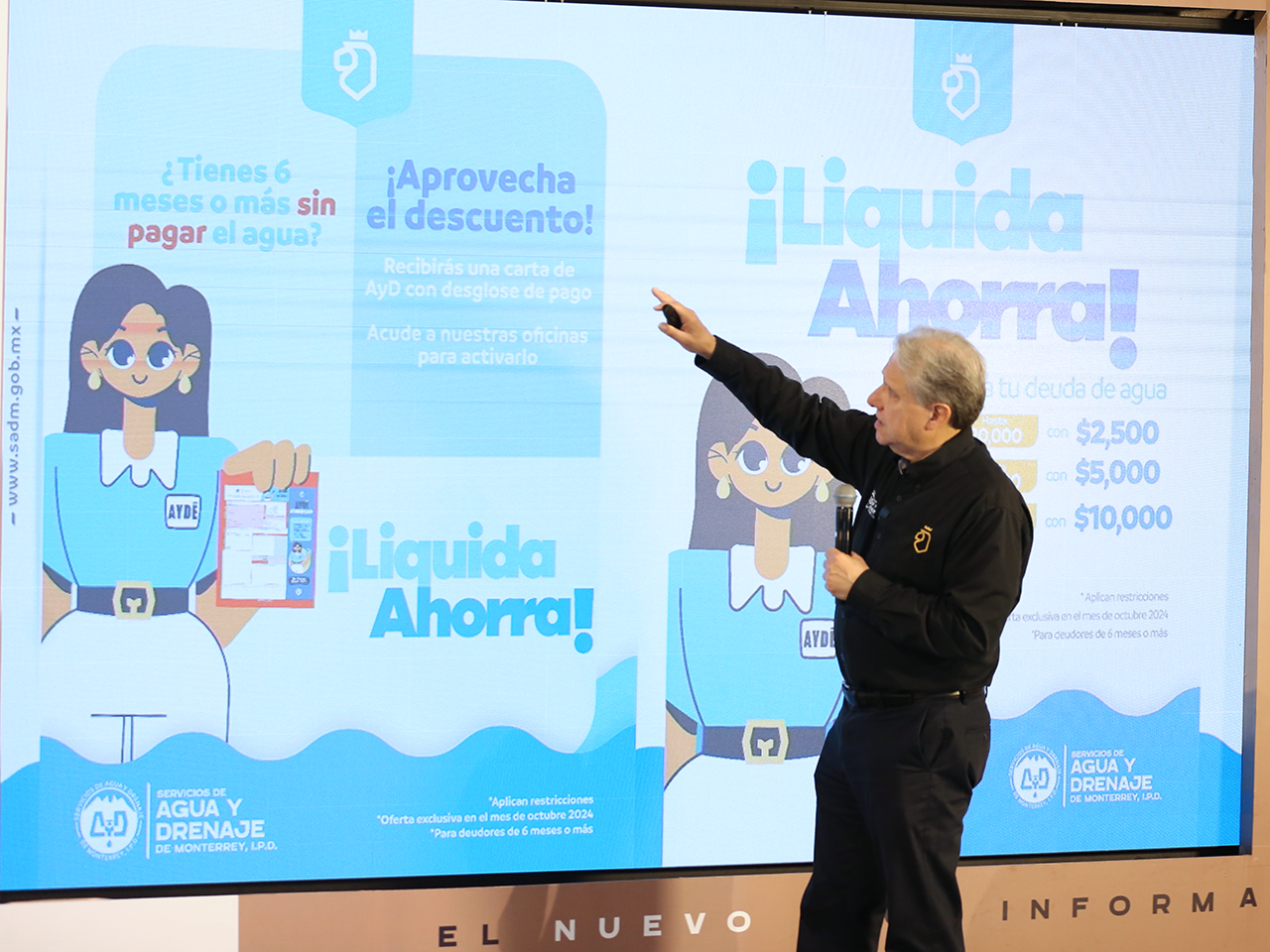 Monterrey, Nuevo León.- El Director General de Servicios de Agua y Drenaje de Monterrey, Juan Ignacio Barragán, dio a conocer el nuevo programa de regularización para usuarios con adeudo de agua, el cual lleva por nombre “Liquida Ahorra”.