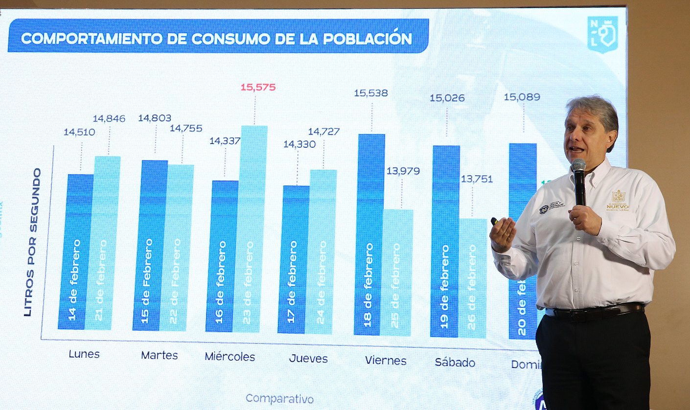 Al mencionar que el consumo de agua en la población se redujo considerablemente de una semana a otra, ya que de 15 mil 575 litros por segundo que se consumían, al 27 de febrero se bajó a 13 mil 721 litros por segundo.