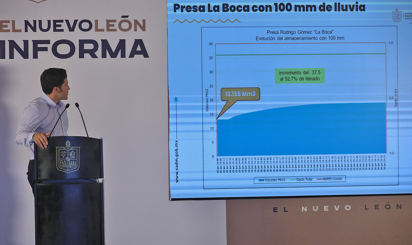 Lo anterior, al precisar que en la Presa La Boca se podrían tener acumulados de hasta 301 milímetros (mm) favoreciendo a un llenado de  99.3%; 200 mm en la Presa El Cuchillo que en el mejor de los escenarios alcanzaría un almacenamiento del 74.5%; y 180 mm en Cerro Prieto que podría llegar a un nivel del 15.8%; y la Presa Libertad se podría beneficiar hasta contar con un 21% de su llenado.
