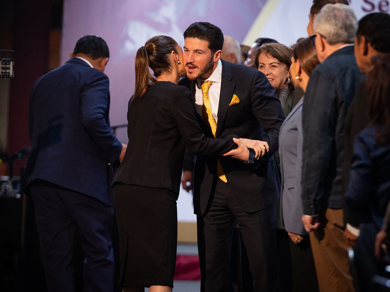 "Me toca compartir la intervención con el gobernador (Pablo) Lemus de Jalisco. Queremos en primer lugar agradecerle todo el apoyo a nuestros estados. Nuevo León y Jalisco han tenido grandes resultados. Las aportaciones, Presidenta, que queremos hacer valer tienen que ver con mejoras que creemos pueden ser muy rápidas.