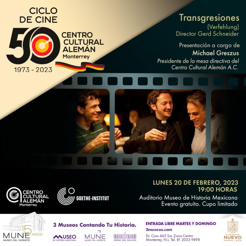 Dentro del Ciclo de Cine del 50 Aniversario del Centro Cultural Alemán, la película Transgresiones, del director Gerd Schneider, presenta la historia de Jakob, Dominik y Oliver tres amigos unidos no solo por jugar juntos al futbol o ir a la cantina de vez en cuando, sino también por su profesión: son sacerdotes. Jakob trabaja como capellán de prisión, Dominik trabaja en una iglesia y Oliver aspira a una carrera en la jerarquía de la iglesia.
